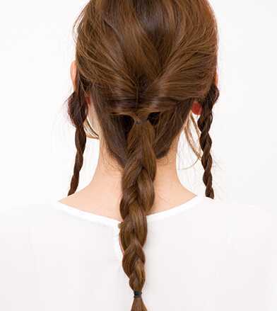 步骤四:将两条细辫往三股辫的方向拢在一起,最后将发尾扎起即可。