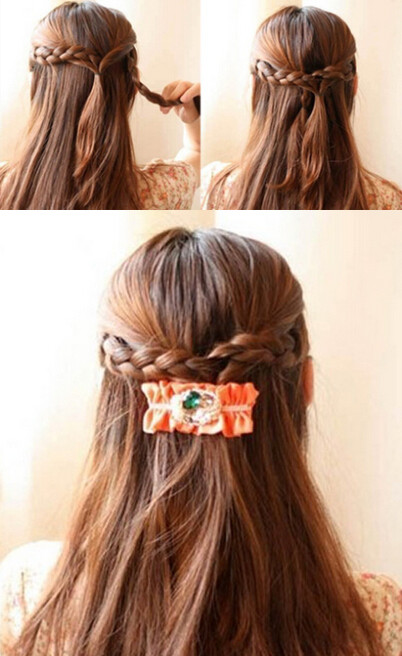 韩式编发05》》》》》最后,可以选择自己喜欢的发饰或发带,别于橡皮圈固定的位置即可,整个发型就轻松完成了。