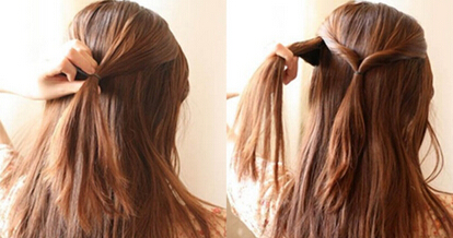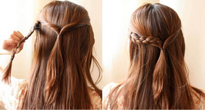 韩式编发01》》》》》首先将头发梳顺理直后,用梳子从两侧挑出等量的一小撮秀发,然后将两撮秀发绑于脑后,效果如图。