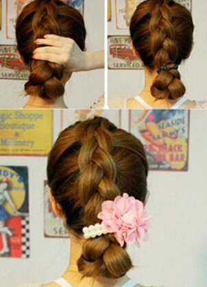 韩式编发教程05》》》》》最后,可以使用自己喜欢的发饰别在橡皮圈固定的地方即可完成这样仙气十足的韩式编发。
