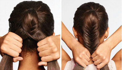 韩式蜈蚣辫step5》》》》》按照这样的手法,以此类推,每次都是从左右两边抽出发束进行同样的步骤,直至编完整个蜈蚣辫发型位置,最后再利用橡皮圈固定即可!