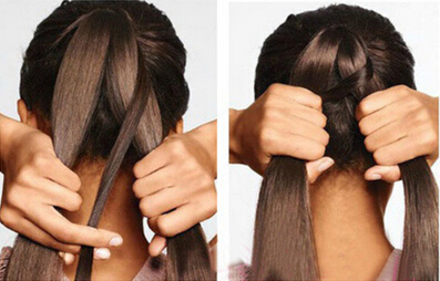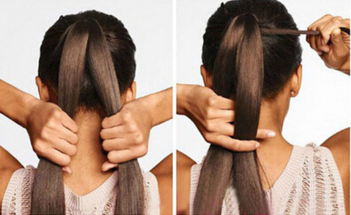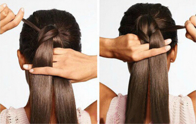 韩式蜈蚣辫step2》》》》》然后从左边的发束中取出一缕细发束,从马尾的后面绕到右边(如图)
