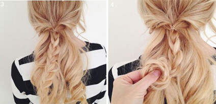 【花朵编发教程step04】固定好麻花辫之后,就从发尾开始将整条麻花辫以花朵的形式向上卷起来,以最为蓬松的形态呈现。