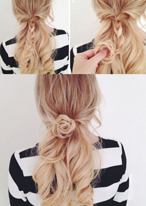 【花朵编发教程step05】将花朵发辫卷至中间固定的地方,这时花朵的形状就已经完美呈现咯,然后再调整好花朵的形状后用一字夹固定即可。