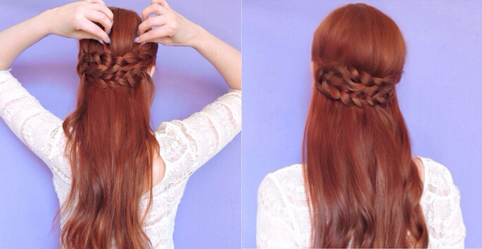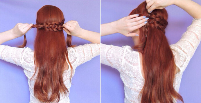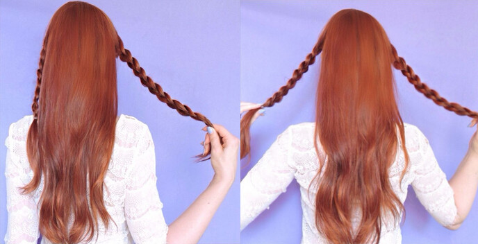 【韩式编发step03】接着,将固定好的两条麻花辫相互交叉发型的中间位置,在接近耳朵的将两条麻花辫的发尾向下,然后利用一字夹固定即可。