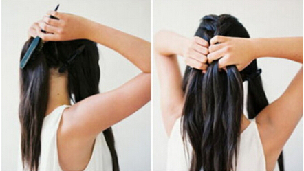 【编发教程step01】首先将秀发梳直理顺之后,留出耳朵前额的秀发,将脑后的秀发全部梳拢。