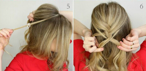【鱼骨辫教程step03】再从另一侧挑出发束压住第四束,往内里编发即可,而接下来的步骤重复上诉的两个动作完成即可。