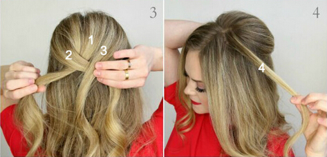 【鱼骨辫教程step02】将取出的发量平均分成三份(如图)然后在随意的一侧挑出一小束发丝,将第四发束压在三等分发束上编发(如图)