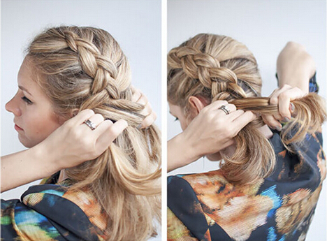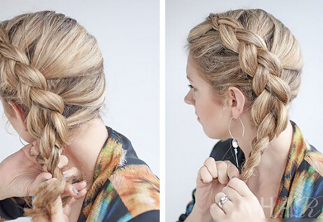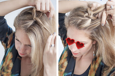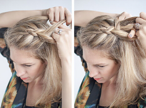 【侧编发教程step02】把秀发编到中间时,从两侧分别挑出少许发束交叉在一块,形成编织即可(如图)