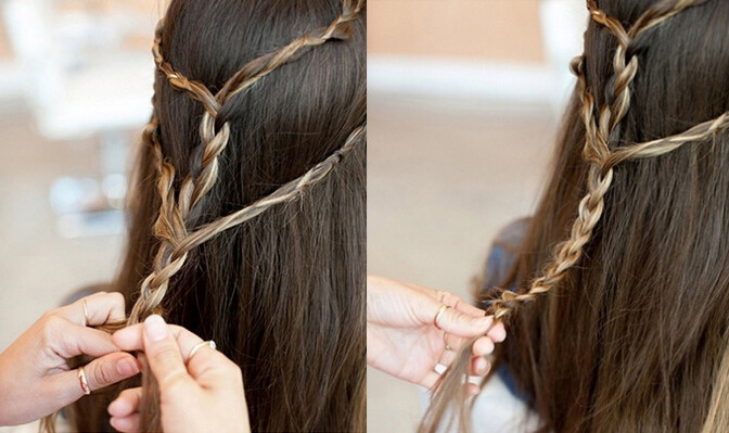 【公主头编发step02】接着从右侧的下方(如图)取出三束秀发,也是编成三股辫的造型即可,而另一边也是采取同样的方法编织麻花辫,然后将这两束一起固定于脑后即可。