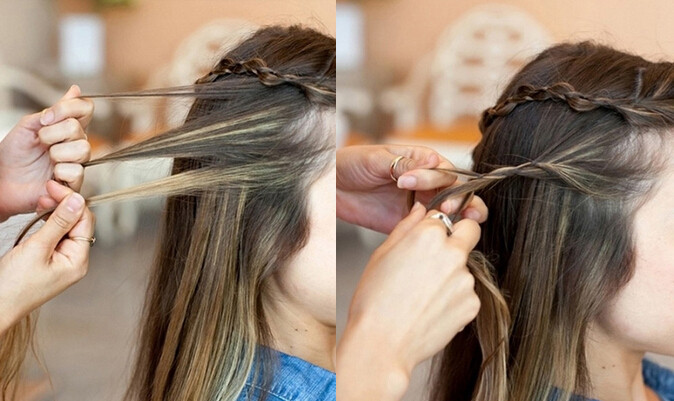 【公主头编发step01】首先梳理整齐秀发之后,先取出右侧头顶的头发编成一条麻花辫固定在脑后(如图)
