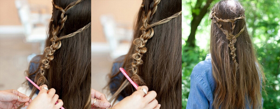 【公主头编发step03】接着,把固定于中间的全部麻花辫合并在一起编发,一直编制到发尾,然后留出少许的头发即可。