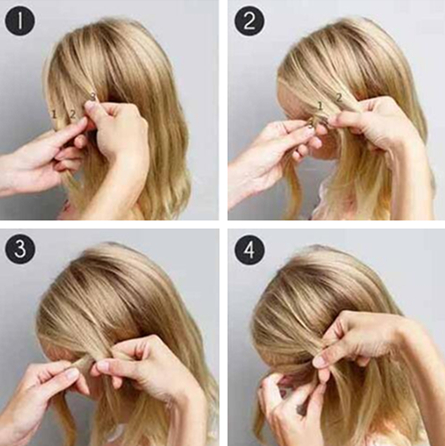 首先,将女孩的刘海分区,然后取一束头发分成三小束,从左到右编号1、2、3,然后将3号发束置于1、2发束的下方,再将2号发束置于1号发束上面。之后再取一束头发分成3小束,按照上述步骤一直编发。