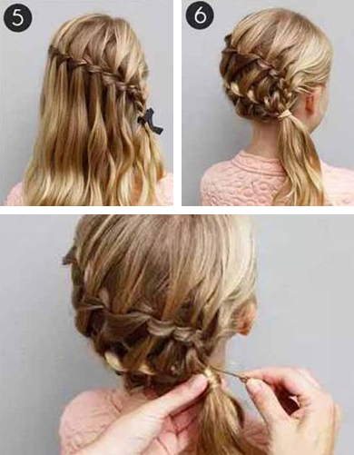 编发过程中,你要将发辫不断向另一边的耳朵偏移,之后将头发编成三股辫,固定好发尾。然后按照上述方法所示,将余下的头发编成上面那条辫子一样,最后将发尾合并在一起,扎成一条侧马尾。最后从发尾中取一小束头发缠绕在橡皮筋上,最后用发夹固定好即可。