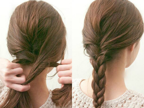 按照图示,将头发分成三等分后编成三股麻花辫,尔后使用一条橡皮筋绑好发尾。