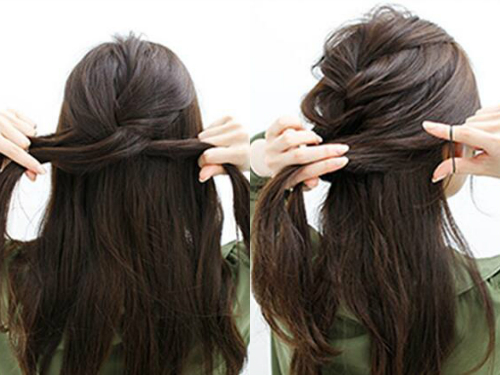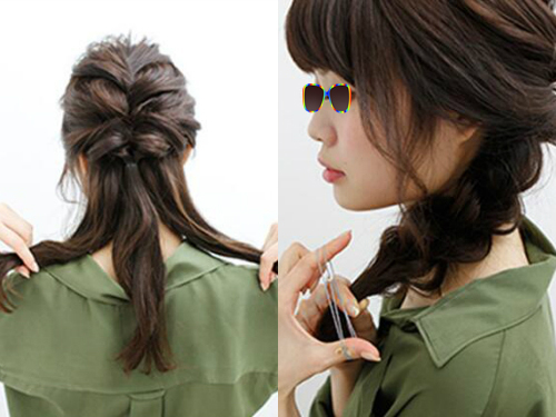 打理一下下层的头发,然后将其分成平均的三等分,编出一条三股麻花辫,编到发尾时,可使用橡皮筋固定好。