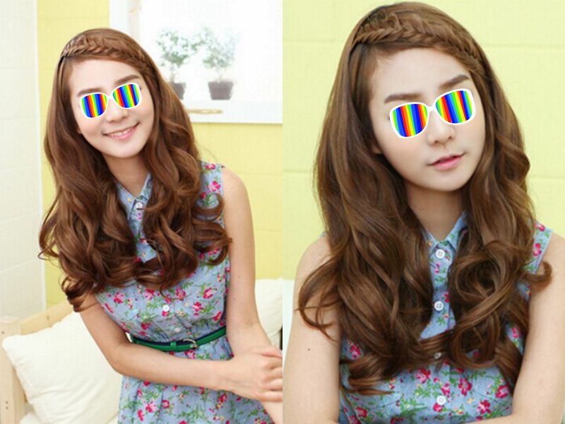 相对于把头发全部编起来,也许还有的妹子喜欢披散着头发,那也没关系,可以只在额前编一条鱼骨辫使其斜挂与头上,不仅遮住了发际线,更使妹子看起来甜美客人,一头卷曲的长发看起来也是弹性十足,加上棕色染发更使整个发型变得时尚靓丽。