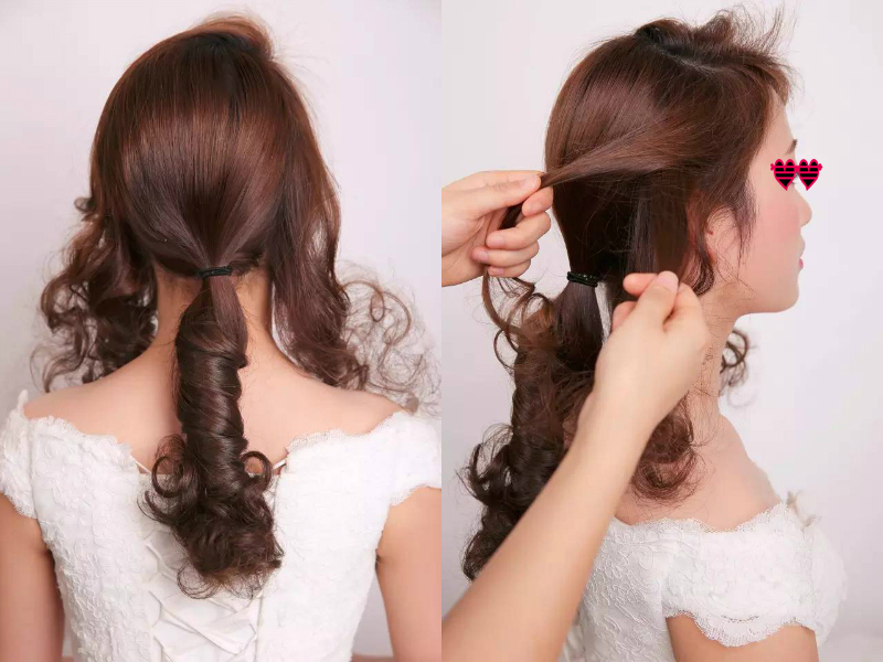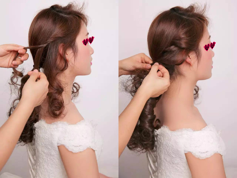 然后开始处理前侧留出的头发,把一侧散开的头发分成两小部分,以叠加扭转的方式缠绕成一条发辫,缠绕时发辫松紧适度即可,编到耳后的位置。