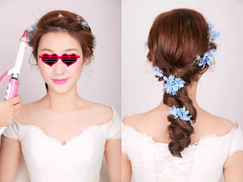 用电卷棒将头部两侧的发丝轻轻烫卷,赋予发丝自然灵动的感觉,最后在头发的侧边和马尾上用蓝色的永生花进行点缀装饰,整个编发就完成了,是不是感觉特别的仙气十足呢?