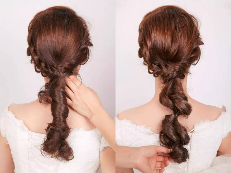 然后把编好的辫子从上往下绕过马尾,按之前的处理方法那样,以马尾为轴心把辫子进行缠绕,好了后就固定住,并隐藏好发夹。再将马尾部分的头发上下分为两股,并顺着卷发的方向拧紧,用皮筋分别在马尾的二分之一处和发尾部分的位置扎好固定。