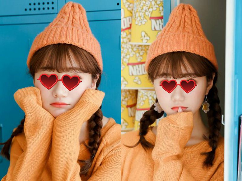 1.妹子可以把头发分成两半,分别拨一边,然后编成个简单的马尾辫,两条自然垂下的辫子很好的修饰脸型,轻薄透气的空气刘海隐约透出清秀的眉眼,棕黄色的染发也让头发更有时尚感,搭配一身橘色的衣服和帽子,俏皮可爱极了。