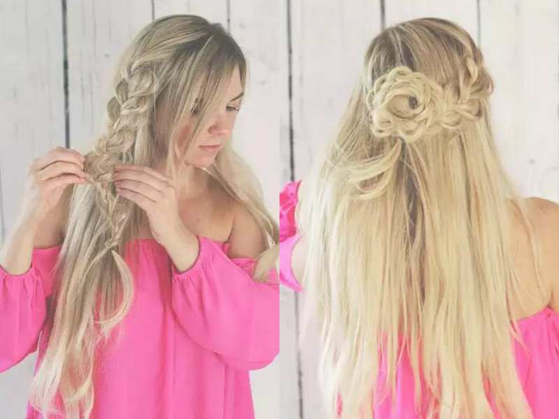 在头发的一侧也是编一个简单的辫子,然后慢慢撕开呈现出蓬松的效果,把它放到脑后,顺时针卷起来,是一朵玫瑰花的样子,是不是太奇妙了,小仙女既视感 ,仙气十足。