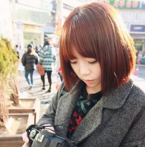 棕红的染发色,在阳光的照耀下,让一款简单俏丽的波波头显得脱颖而出,整齐的齐刘海同样是甜美修颜的一大体现。