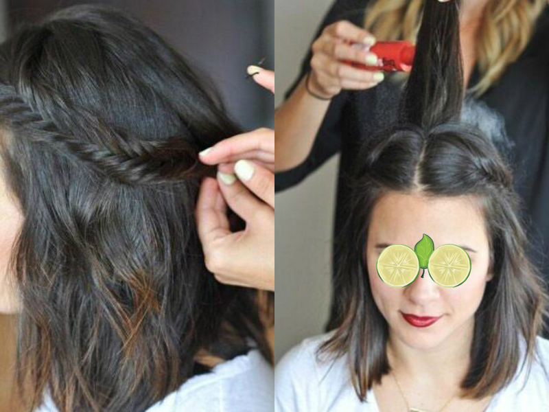 lob头编发步骤5》》》》》当两个小辫子都编好时,将它们拉向脑后交汇在一起,然后固定好。