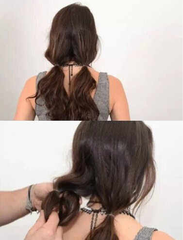 【lob头扎发教程step01】首先,头发梳理之后将其平均分成两份(如图)然后扎成两个低马尾造型。