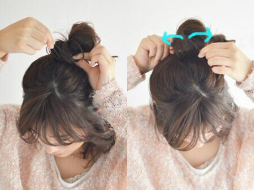 将余下的发尾缠绕在马尾根部上,使用发夹固定好,让其形成一个丸子头,然后用手将丸子头往两边拉扯。
