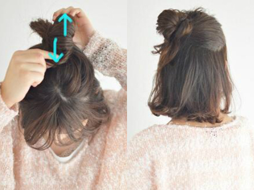 之后再将丸子头往上下相反的方向拉扯,令丸子头造型更立体,最后将余下的头发打理一下就好了。