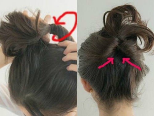 将橡皮筋拉下一些,在马尾根部中部挖一个小洞,将马尾旋转后穿进洞里再拉出来,如右图所示。