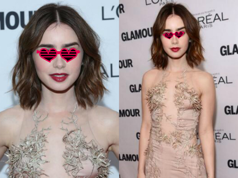 鹅蛋脸可是最美的脸型之一,怎么可能会不适合wob头发型呢?中分的刘海设计使莉莉柯林斯精致的鹅蛋脸一览无遗,无刘海的遮挡更是突出她的浓眉大眼,两边的头发柔顺中带着些曲线美,短至锁骨的发尾再搭配露肩裙更是展现出她优美的肩膀线条,整个人充满了高贵的气质。
