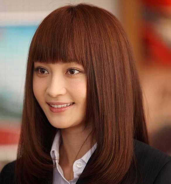 这一款梨花头长发是童佳倩剧中的发型,齐刘海,深棕的发色,向内卷的发梢,显得乖巧可爱,还带着一种时尚感,是很惹女生喜欢的一款发型。