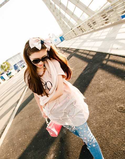 一眼看过去,甜美又有气质,微黄的头发,时尚感十足,一个粉红大蝴蝶结发箍超甜美哦,搭上一副墨镜,气质+甜美,赞一个。