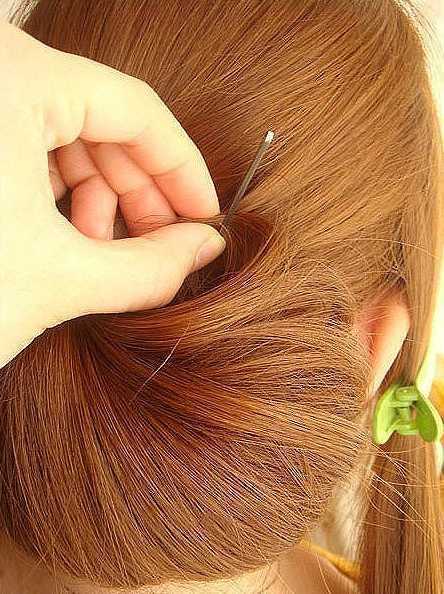 将扎好末端的马尾如图往上面散开弄,再用发夹把头发固定好,要弄出两个椭圆哦。