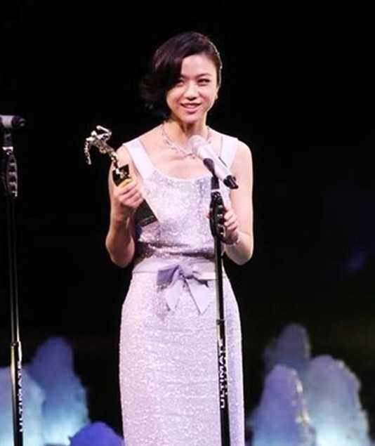 拿着奖杯站在领奖台上的汤唯,优雅甜美,极具魅力,单边盘发充满了复古感。