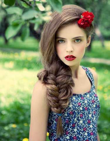 2013最时尚伴娘长卷发DIY编发发型,全部放在一边的编发,再增添上红色花朵,有种田园的清新,这样好看又迷人的伴娘长卷发会令你气质提升,桃花运UPUPUP!!!