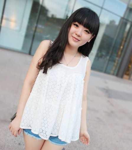 淡淡的妆容,配上这样一个甜美的长卷发,怎么样?很棒吧!剪得有点碎的刘海,凸显出精致小脸,随意搭在肩上的头发更是充满了美感!白色的蕾丝背心衫,清新自然!