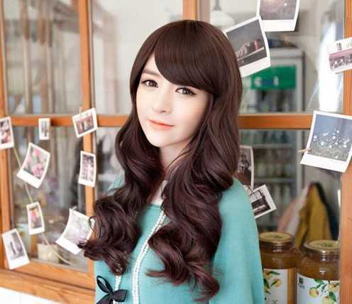 半圆弧度的侧分刘海设计,十分复古,而且有气质,整齐的卷长发十分立体,而且灵动,板栗色的染发,有体谅肤色的效果哦。