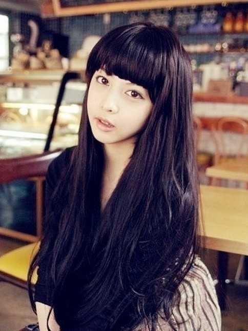 这款长发发型,采用厚感弧度的齐刘海,在视觉上缩减了额头的宽度,两侧柔顺的长发紧贴在脸颊上,十分成功的修颜效果,很适合圆脸的女生哦!