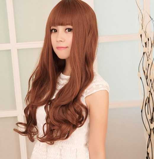 唯美的长卷发型,齐刘海的设计凸显女生大眼的效果,顺滑质感的两侧长发,将一张精致的小脸包裹其中,时尚的深棕发色,温和系的色调很适合在冬季气息里。