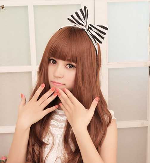 头顶的条纹蝴蝶结发箍又倍增可爱气息,再来一个卖萌的表情,更是甜美十足呀!走淑女风的MM不妨一试这款发型哦!