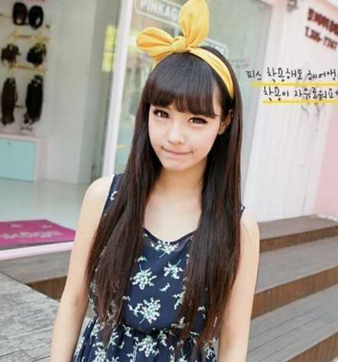 深棕色的染发将女生的肤色显得白皙,直发齐刘海增加减龄效果,垂直的发尾在清新的感觉中散发魅力,一个可爱的大发饰,冬季里尽显甜美哦!