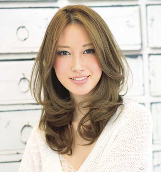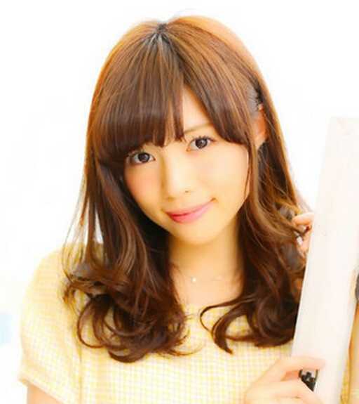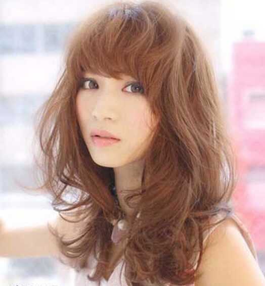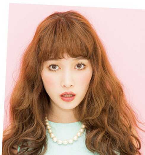 内扣齐刘海长卷发是日本麻豆们最爱的一种,搭配着蓬松蛋卷烫,尽显妩媚小女人范儿。棕黄色染发有提亮肤色的效果,让肌肤呈现好气色。整个造型甜美感之余还有修颜的功效。
