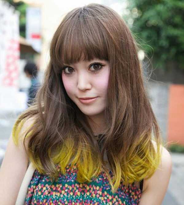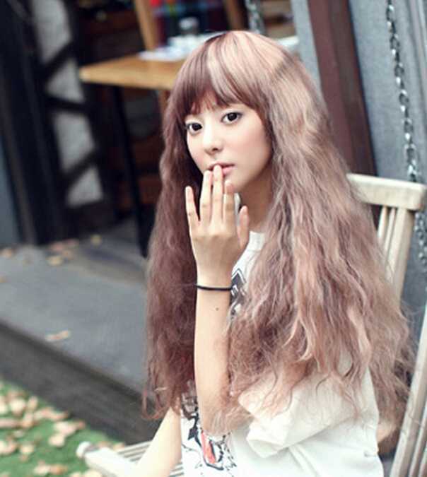 这款浅棕色到发尾黄色的渐变色,突显了精致粉嫩的妆容,很原宿风的feel,厚重的齐刘海更衬托出MM烟熏妆的迷人大眼睛,FASHION绚丽不失个性。