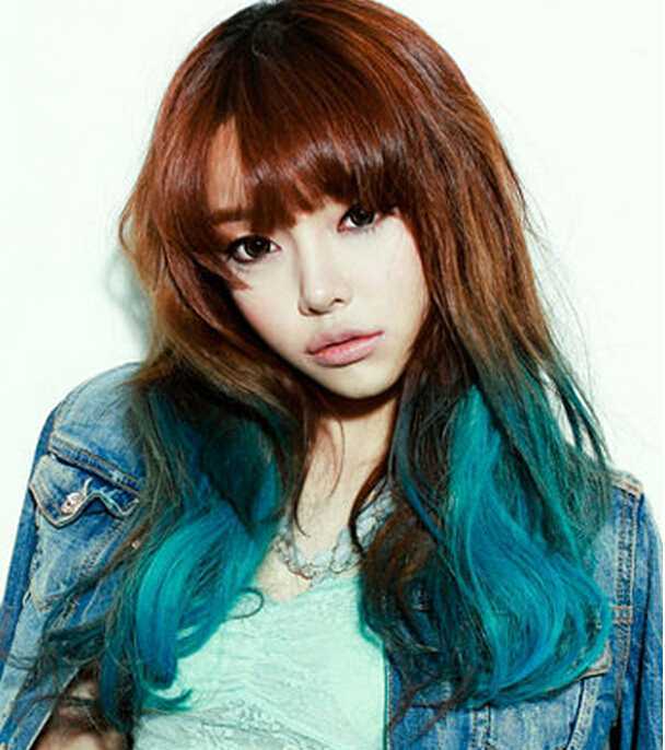 这款浅棕色中长发到中部染上蓝色的渐变色,搭配上间隔齐刘海,瞬间修饰脸型还凸显了个性MM白皙的皮肤且不失个性。
