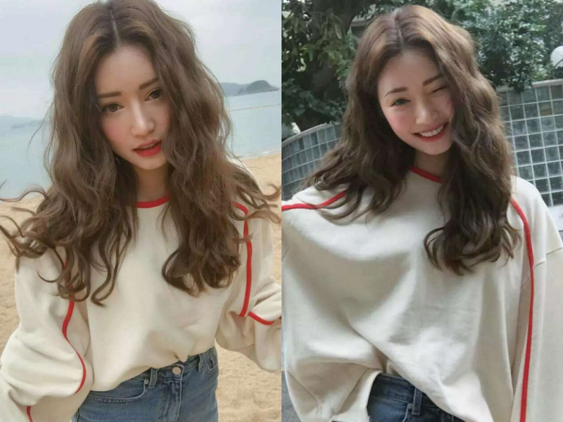 圆脸的妹子都知道露出额头的长发发型可以让脸型看起来变得长一些,从而弱化圆脸即视感,but,加入泡面卷的长发发型可不止酱紫哦,蓬松的泡面刘海在额头两侧制造出弧度感,两侧同样蓬起的头发也有效遮住两腮的肉肉,在视觉上达到很好的瘦脸效果,一头泡面似的长发随意披散着,要多甜美有多甜美。