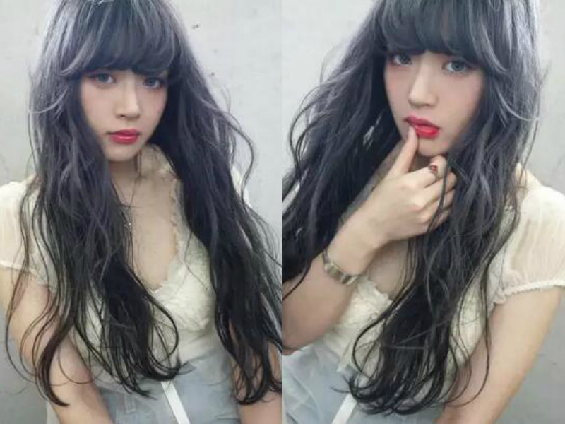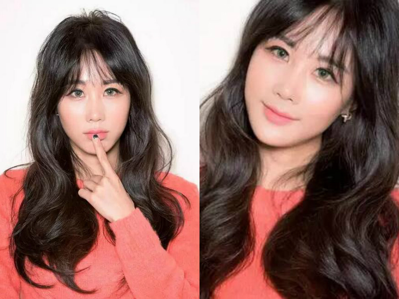 初看到这个妹子小编就被惊艳到了,一头大波浪长发的卷度应该是这几款发型里最轻的,依稀可见发丝弯曲的线条,厚重的齐刘海遮住额头使妹子的五官更为突出,纯黑的发色显得清纯美好,搭配热情红的纯色却又增添了性感的韵味,实在是太撩拨人了。