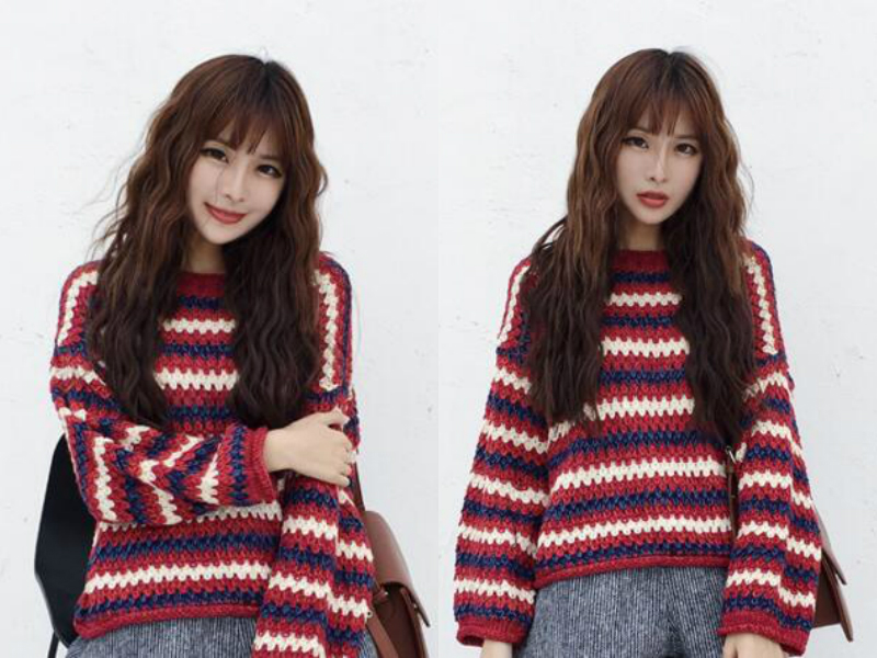 虽说鹅蛋脸很好看无需遮挡,但留个刘海也未尝不好。修剪平齐的刘海轻轻悬挂在额前,遮住额头更凸显女生立体的五官,一头带有小波浪状的长发垂落在脸颊两侧并遮住两腮,更显得女生脸蛋细小,暖黄色的发色让人看了倍感亲切,想必这是个平易近人的女神。